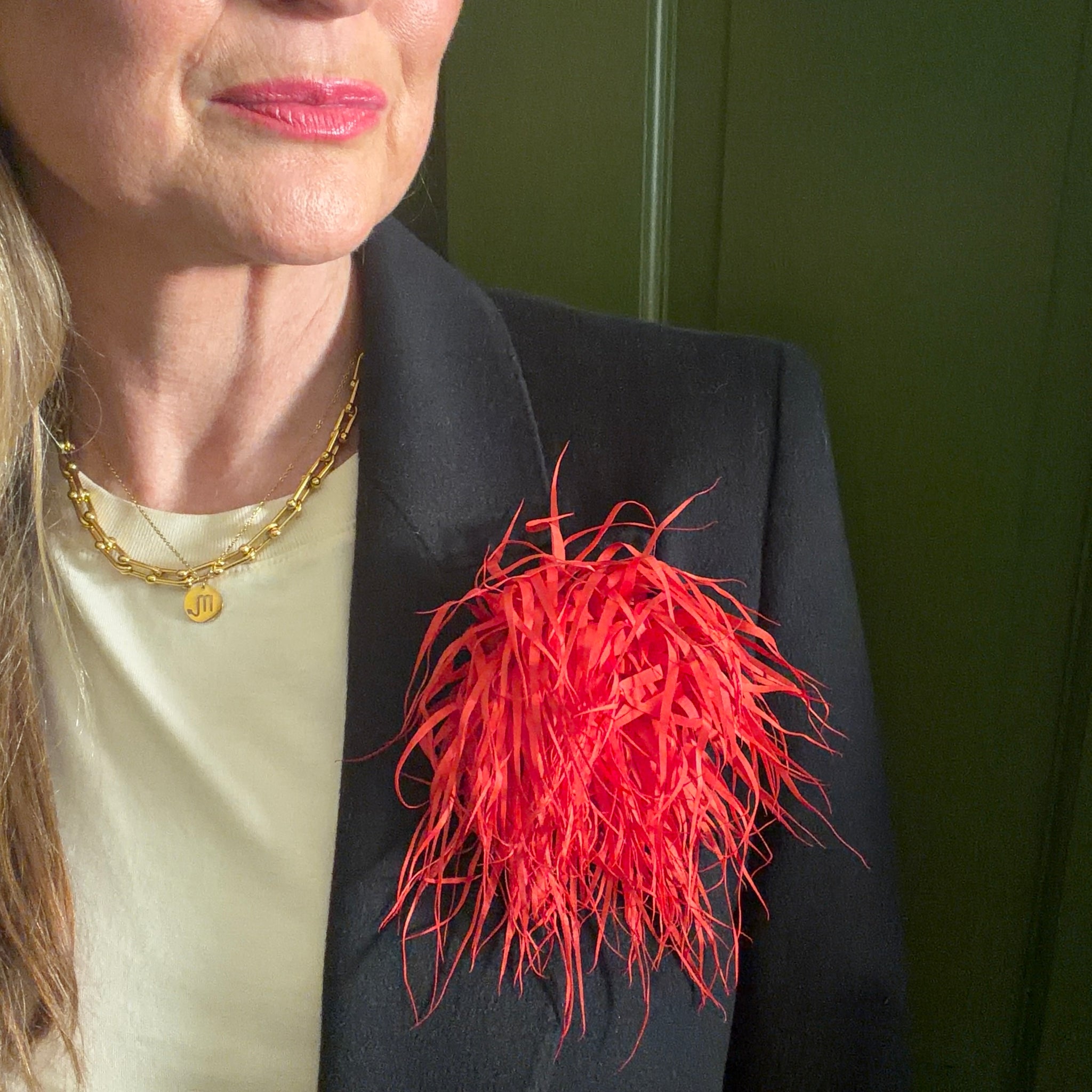 A pretty fabric froufrou flower brooch. Pin and clip fastening that makes this piece really versatile as you use the clip for more delicate pieces or to wear as a hair fascinator. Great for the upcoming race season.