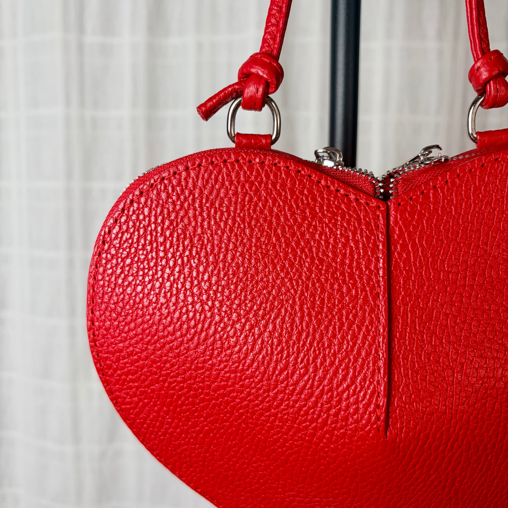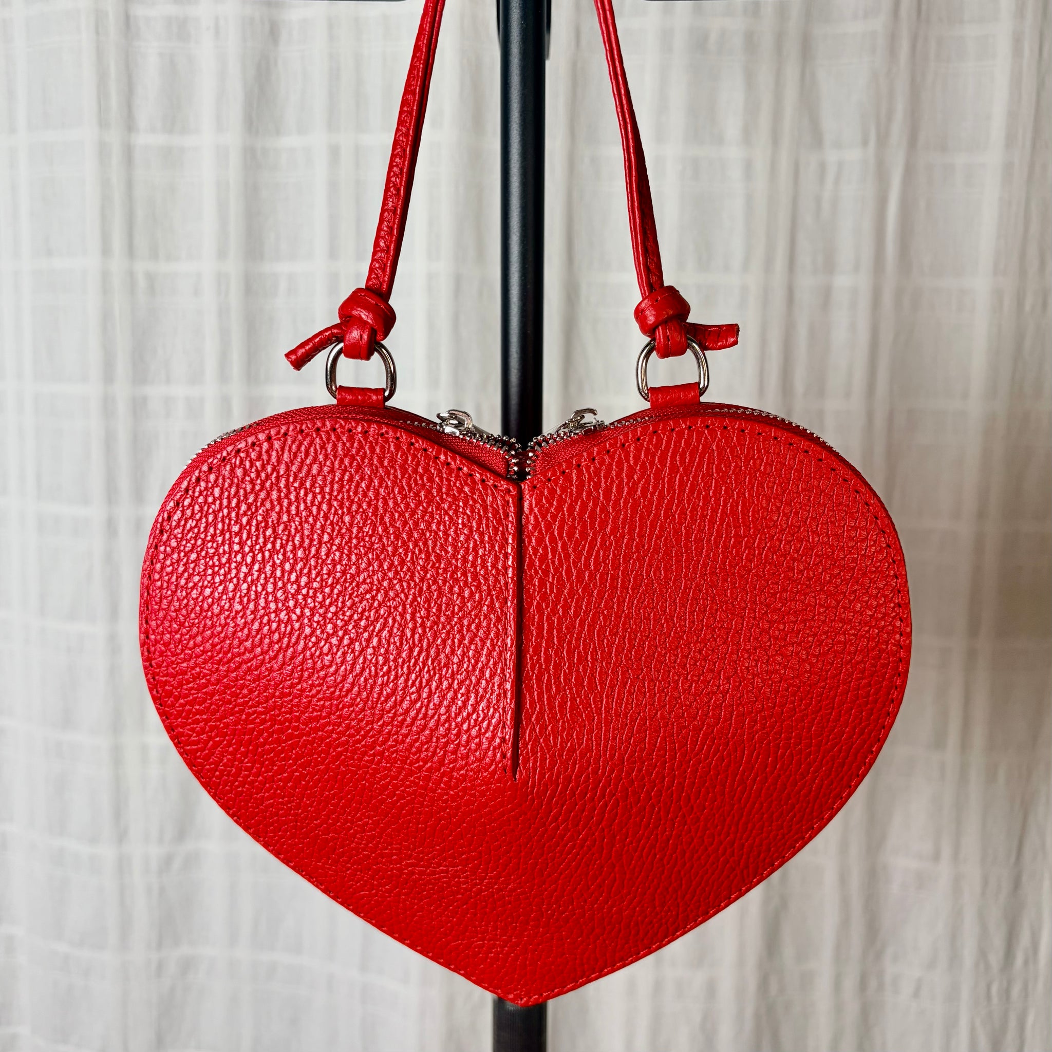 A small handbag in a beautiful heart-shaped design with an adorable red interior. It has a top handle and detachable leather crossbody strap. Perfect for a wedding, or the races, or just to use everyday to bring joy.