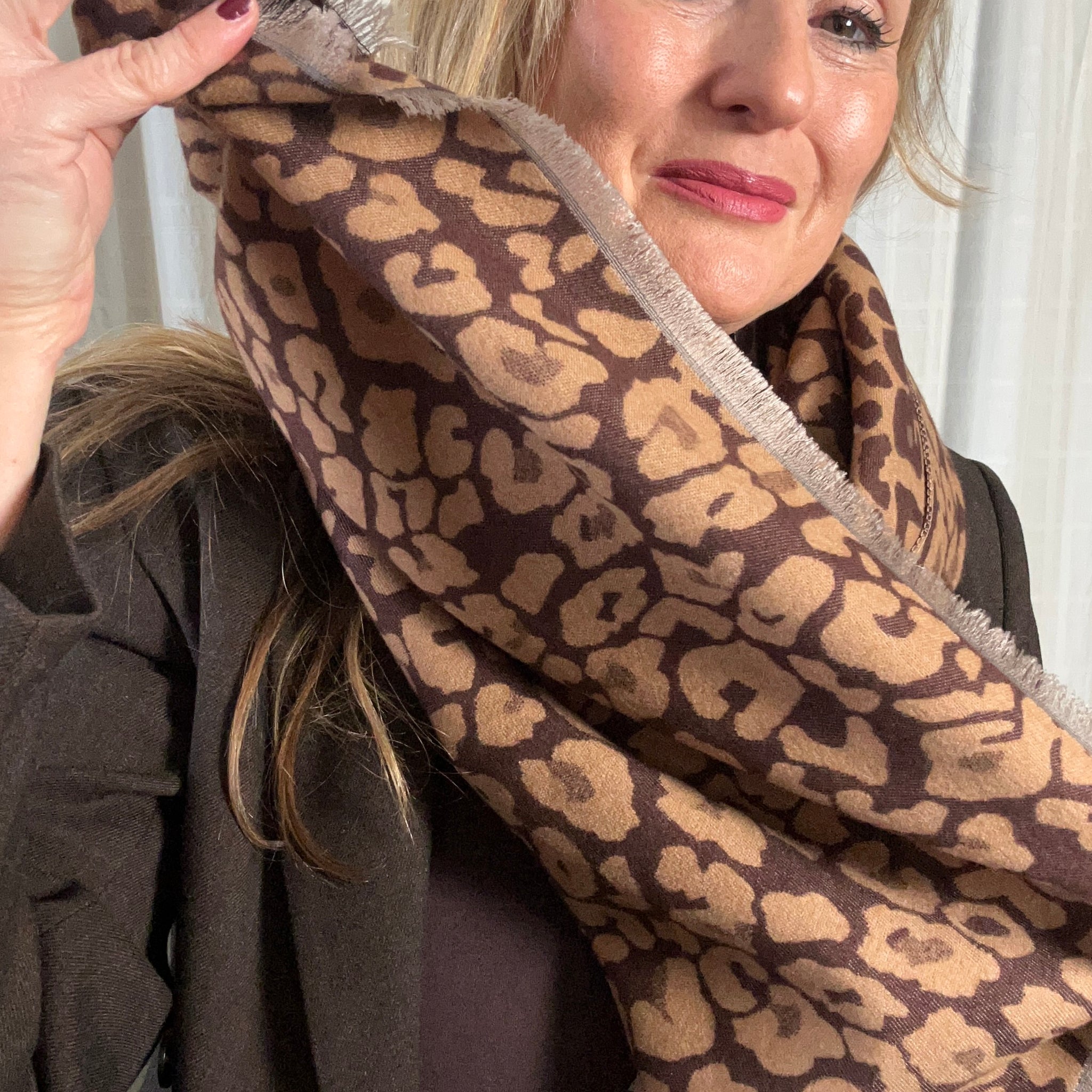 Soft, sumptuous scarf in a particularly lovely leopard print in rich camel and brown.